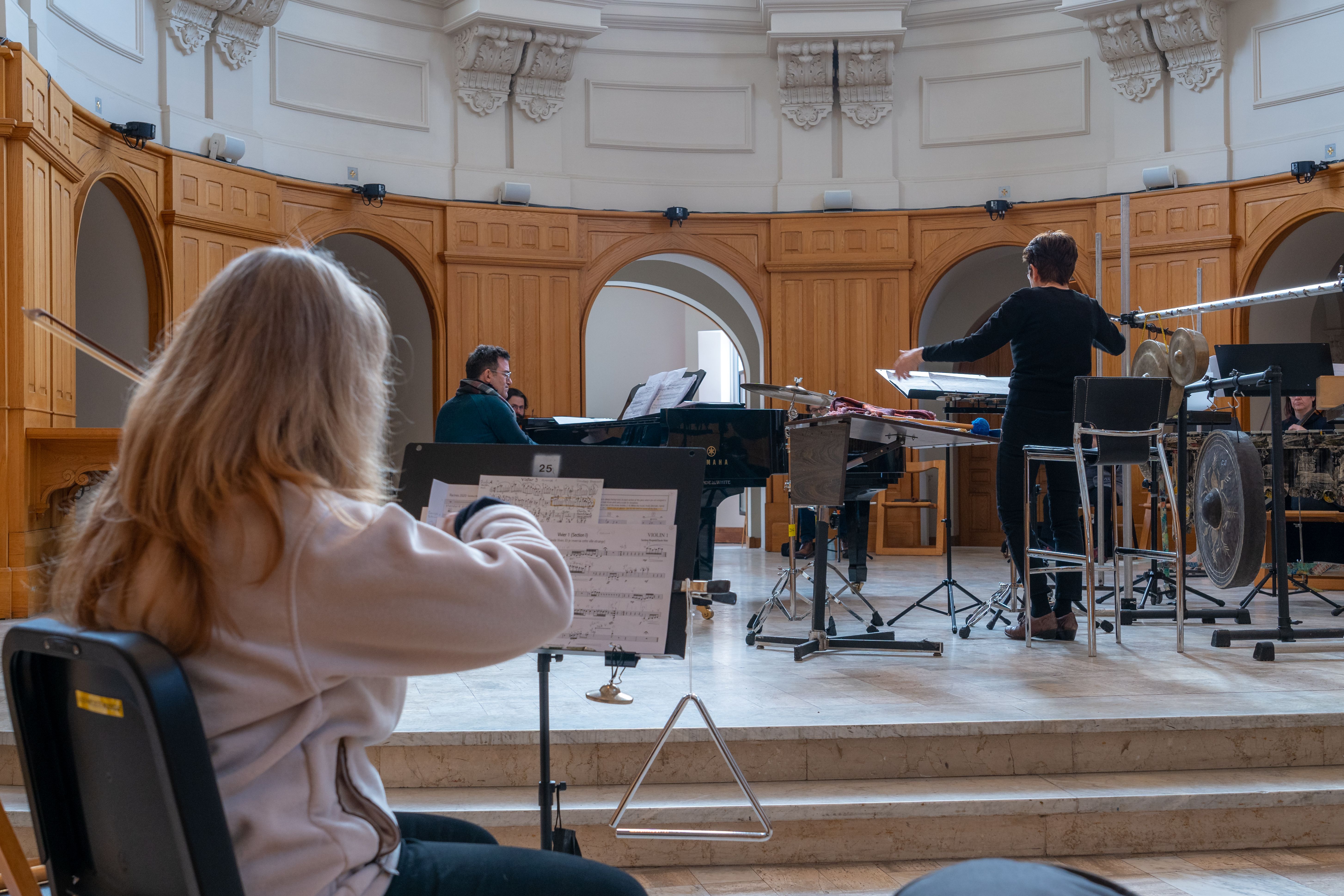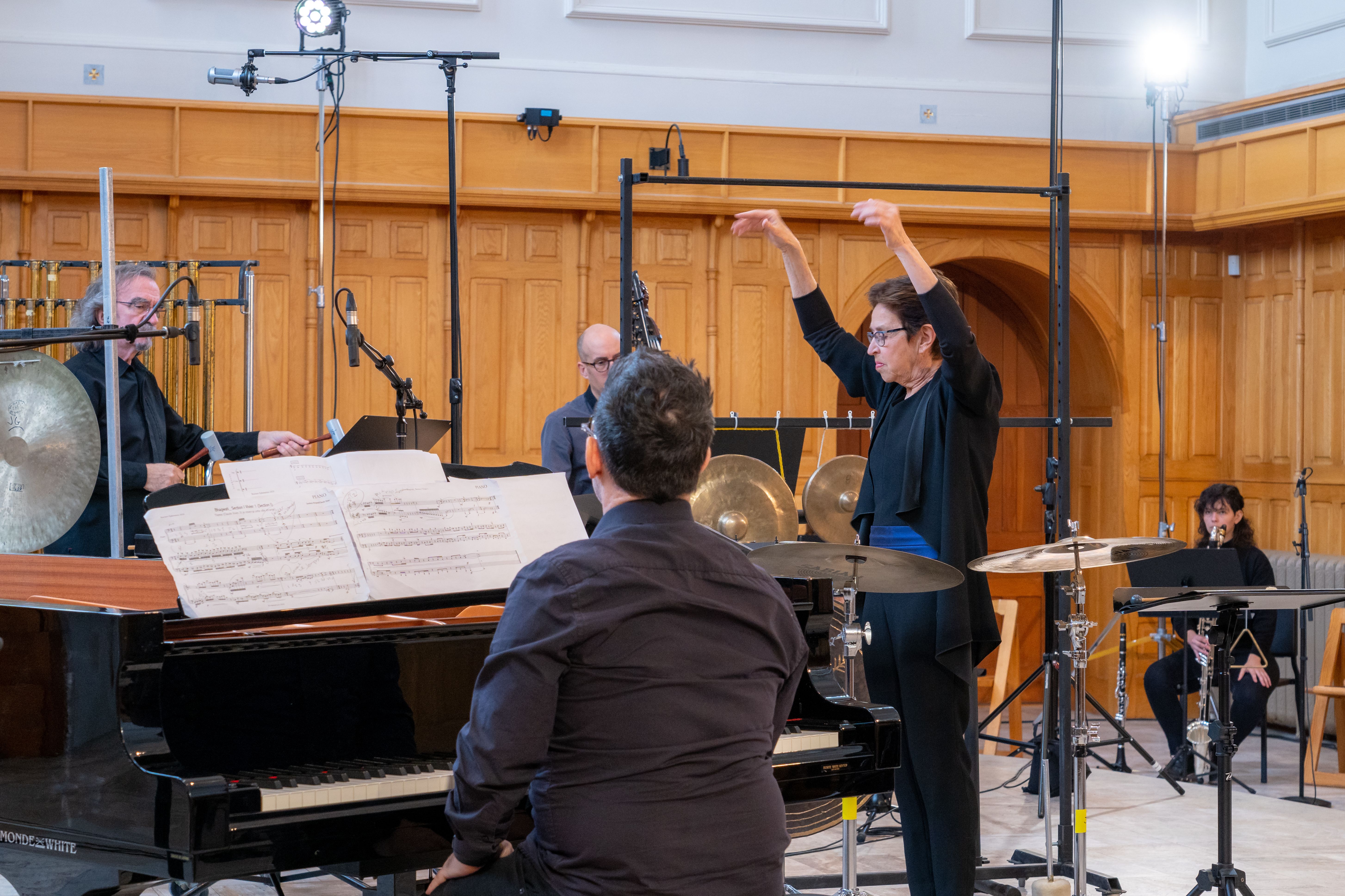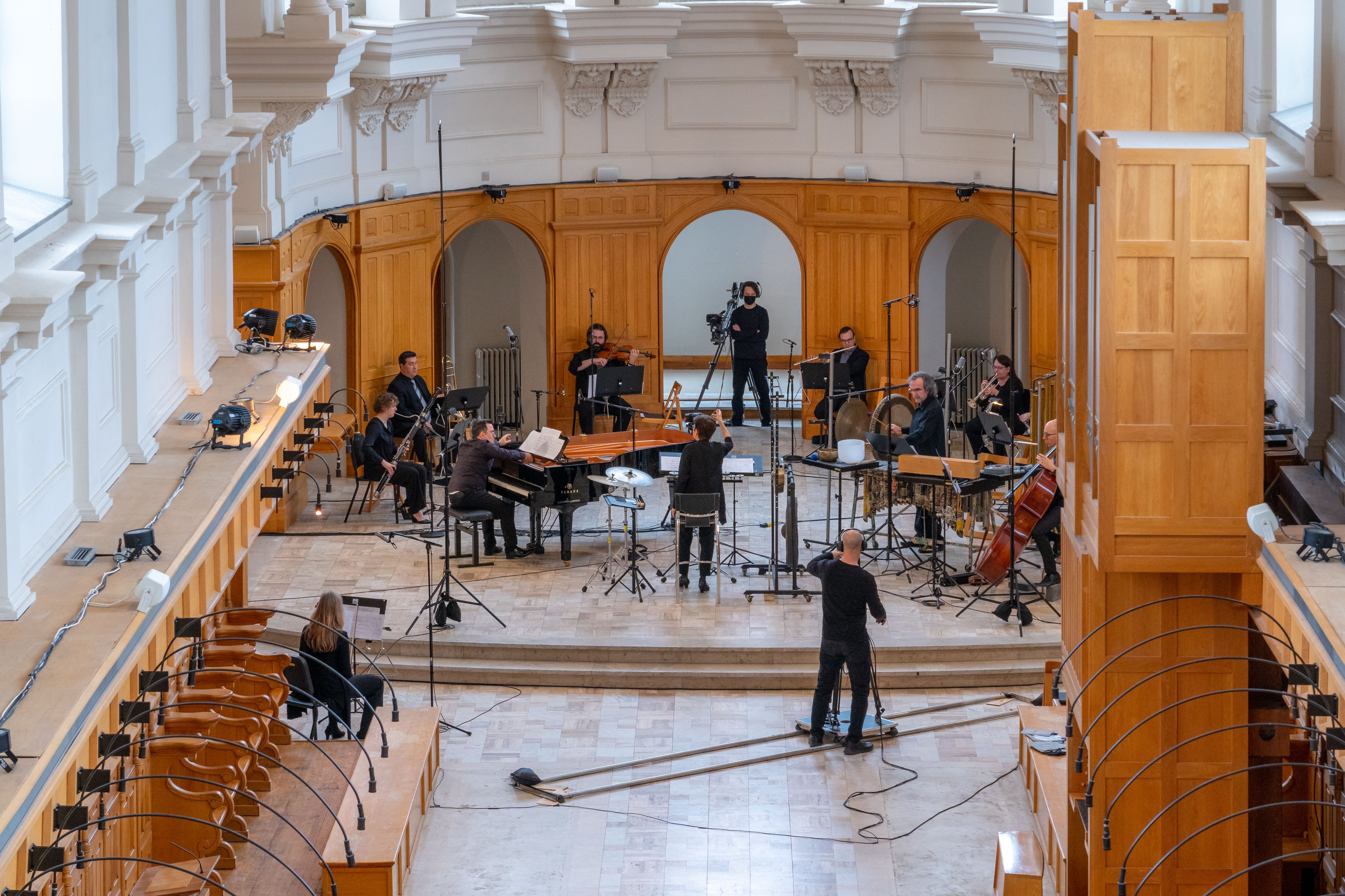 C'est au mois de février 2021 qu'a eu lieu l'enregistrement, au cœur de l'Abbaye d’Oka, où les musiciennes et les musiciens du NEM ainsi que la cheffe Lorraine Vaillancourt étaient réuni·e·s sous l'oeil des caméras.